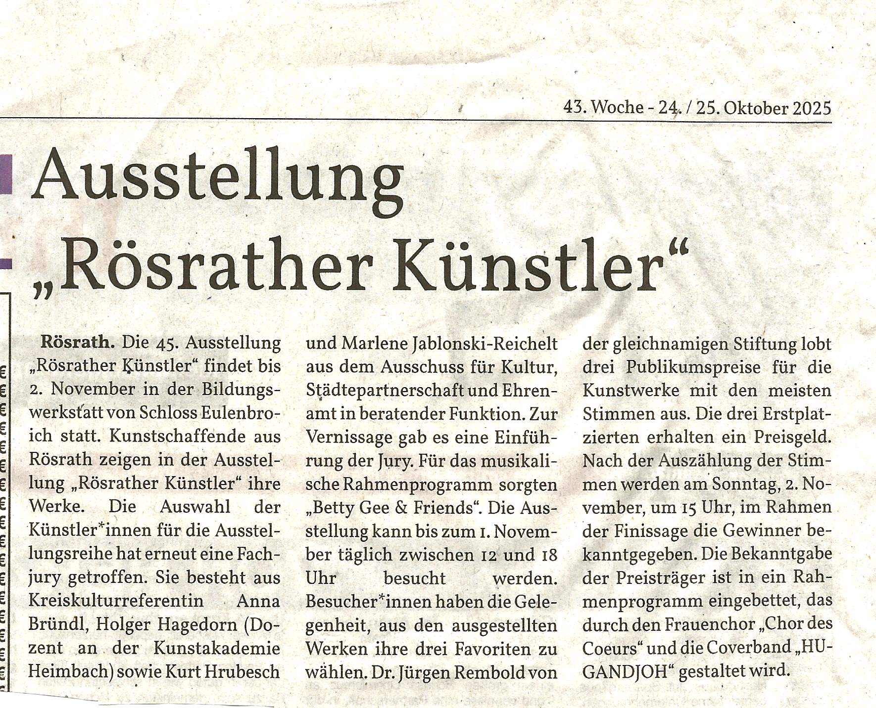 Die Ausstellung „Rösrather Künstler“ wurde im Jahr 1980 ins Leben gerufen und wird seither jährlich durchgeführt. Die Zahl der sich bewerbenden Künstlerinnen und Künstler unterstreicht den hohen Stellenwert der Reihe. Allein in diesem Jahr gingen 151 Beiträge ein, von denen es letztlich 53 Werke in die Ausstellung schafften.