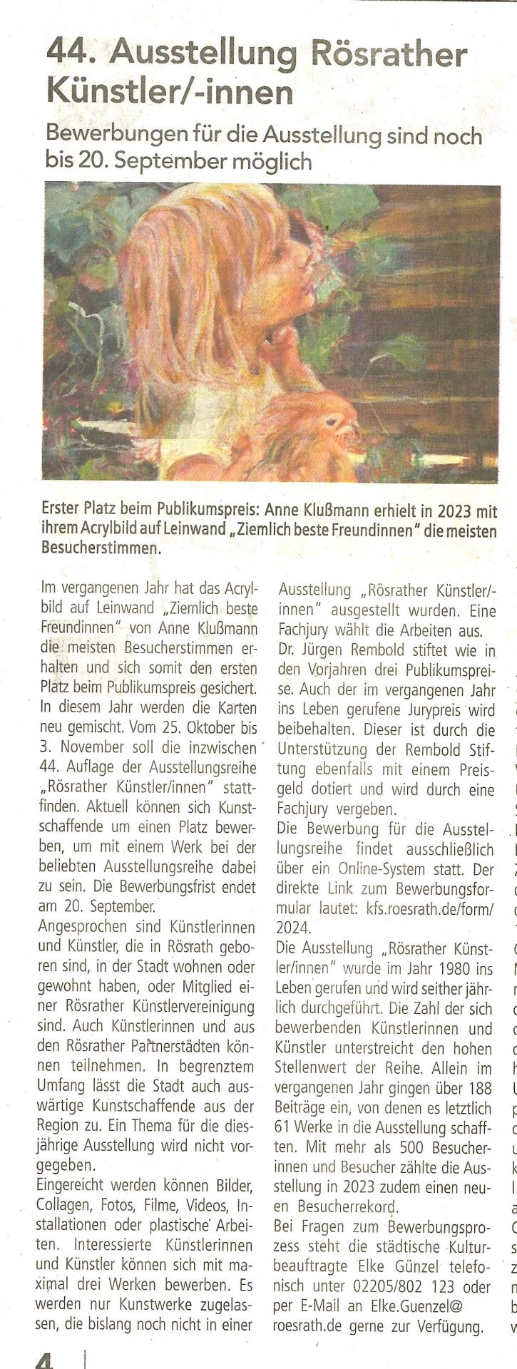 „Die Ausstellung lebt von einer großen Vielfalt an sehenswerten Kunstwerken. Es freut uns, dass diese Vielfalt erneut bei den Besucherinnen und Besucher auf positive Resonanz stieß und wir den Rösrather Kunstschaffenden eine Bühne geben konnten“, so die städtische Kulturbeauftragte Elke Günzel. Neben der Vielfalt der Werke begeistere das Publikum auch die einzigartige Möglichkeit zum Austausch mit den Künstlerinnen und Künstlern. Während des 8-tägigen Ausstellungszeitraums sind diese täglich abwechselnd vor Ort, um die Ausstellung zu beaufsichtigen und im Dialog mit den Besucherinnen und Besucher ihre Werke zu erläutern und zu diskutieren.