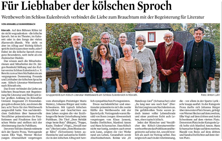 Der Wettbewerb wird von der Rembold Stiftung mit Preisgeldern in Höhe von insgesamt 2.200 Euro unterstützt. Mit 23 Einsendungen war die Zahl der eingereichten Beiträge höher als die Jahre zuvor. Der Abend op Kölsch endete mit der spontanen, musikalischen Einspielung des „Handicap-Leeds“ und der einfühlsam gesungenen Ballade „Sulang mer uns no han“ mit der Aufforderung an alle Anwesenden, die Werbetrommel für den nächsten Kölsch- Literaturwettbewerb zu rühren.