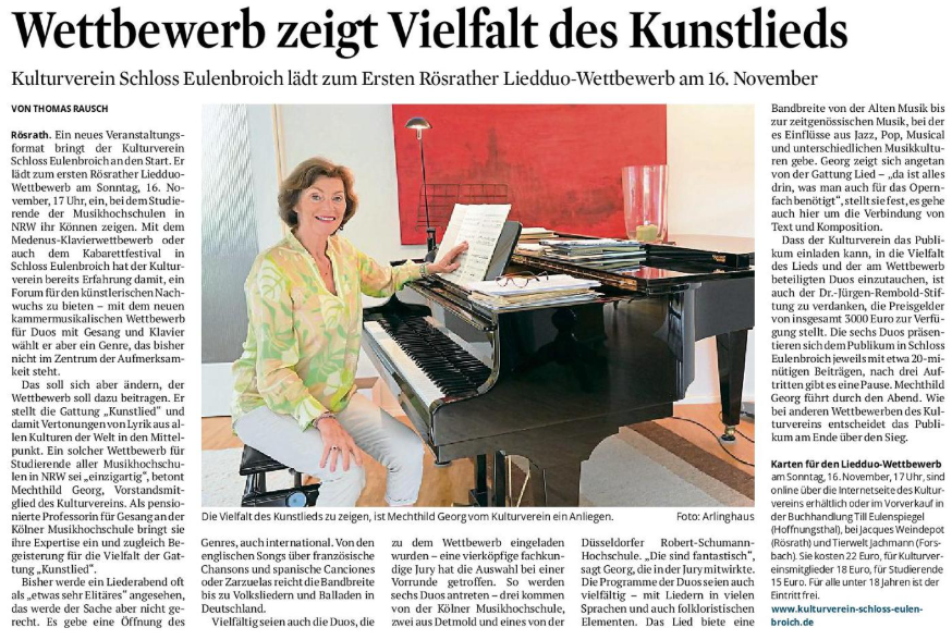 In einem voll besetzten Bergischen Saal von Schloss Eulenbroich feierte der erste Lied-Duo-Wettbewerb seine erfolgreiche Premiere. Der vom Rösrather Kulturverein initiierte Wettbewerb junger Nachwuchstalente in Gesang und Klavier begeisterte mit einem