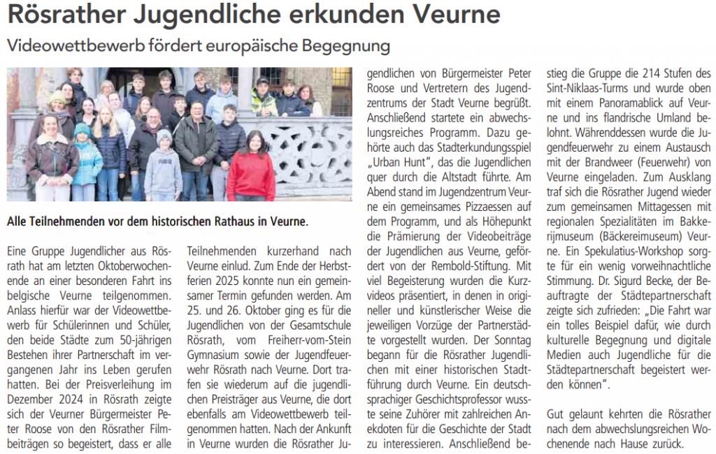 Zum 50-jährigen Bestehen der Städtepartnerschaft zwischen Rösrath und Veurne in Belgien haben sich die Partner im vergangenen Jahr etwas ganz Besonderes ausgedacht: Sie lobten eine Video-Challenge für Jugendliche aus mit dem Motto „Ein Tag in Rösrath – wie stelle ich Besuchern aus Veurne meine Stadt vor“. Auch in Veurne wurde ein Tandem-Kurzfilmwettbewerb gestartet unter dem Motto „Ein Tag in Veurne“, unterstützt von der Rembold Stiftung mit Preisgeldern in Höhe von 600 Euro.