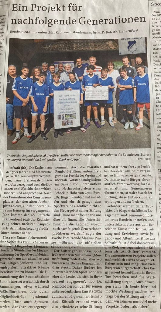 Auf Einladung der Vereinsvorsitzenden Robert-Martin Kraus und Markus Pinger besichtigte Dr. Rembold die renovierten Umkleideräume im Vereinsgebäude an der Sportanlage am Heuweg in Refrath und übergab einen symbolischen Scheck in Höhe von 4.500 Euro im Beisein der Fußballjugend, die dafür ihr Training gerne unterbrochen hat.
