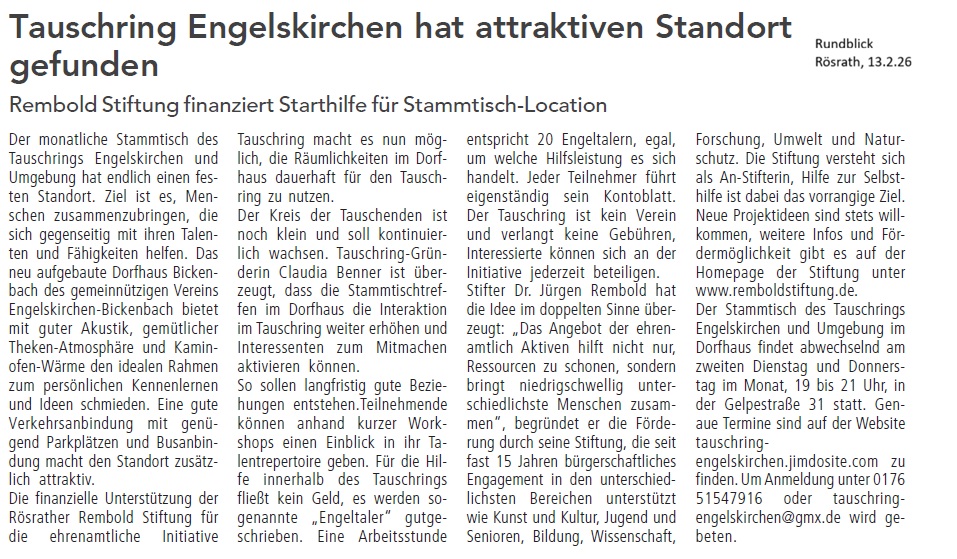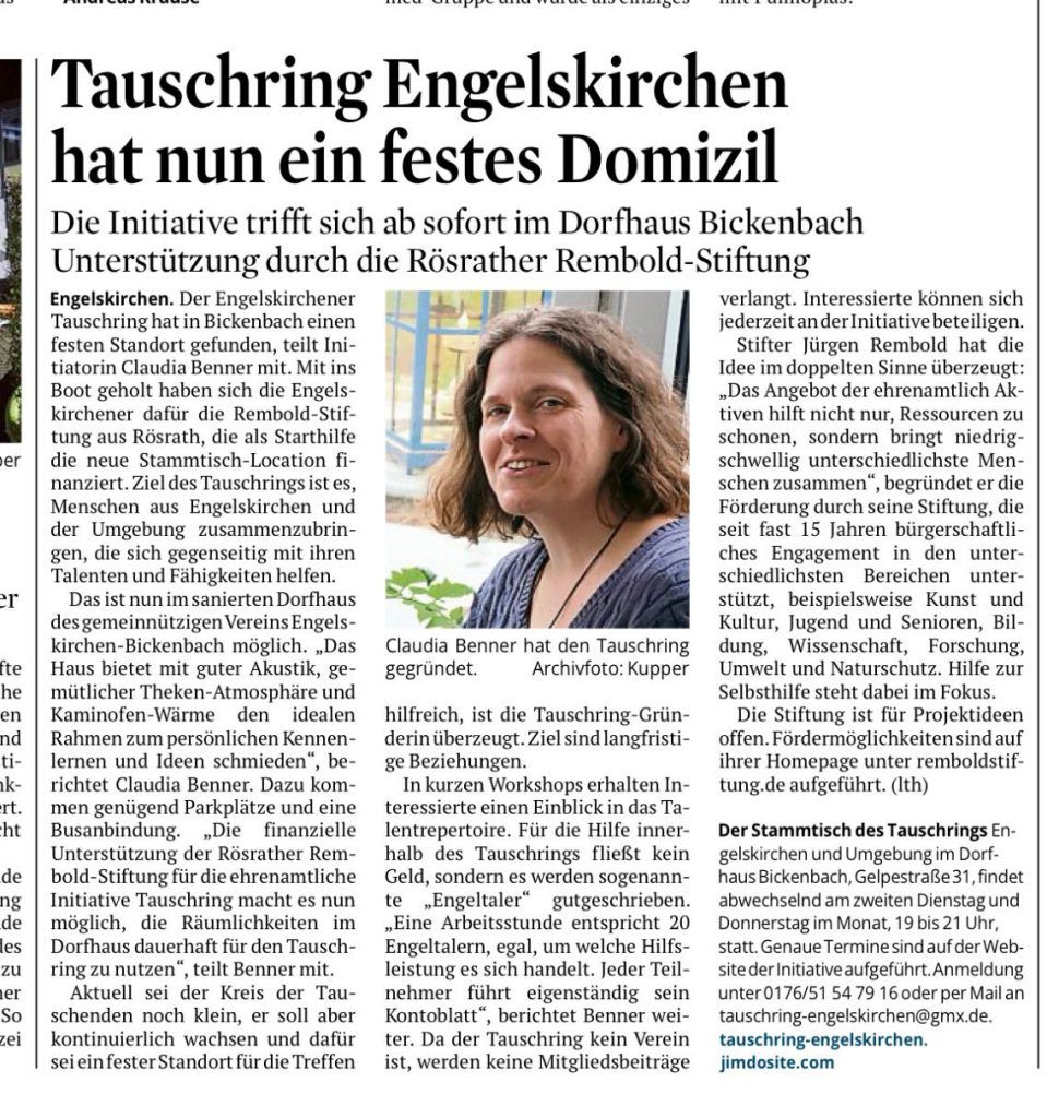 Die ehrenamtliche Initiative Tauschring Engelskirchen und Umgebung hat mit Unterstützung der Rembold Stiftung einen festen Standort gefunden. Das neu aufgebaute Dorfhaus Bickenbach des gemeinnützigen Vereins Engelskirchen-Bickenbach bietet mit guter Akustik, gemütlicher Theken-Atmosphäre und Kaminofen-Wärme den idealen Rahmen zum persönlichen Kennenlernen und Ideen schmieden. Ziel des Tauschrings ist es, Menschen zusammenzubringen, die sich gegenseitig mit ihren Talenten und Fähigkeiten helfen. Die finanzielle Starthilfe der Stiftung ermöglicht es nun, die Räumlichkeiten im Dorfhaus dauerhaft für den Tauschring zu nutzen.