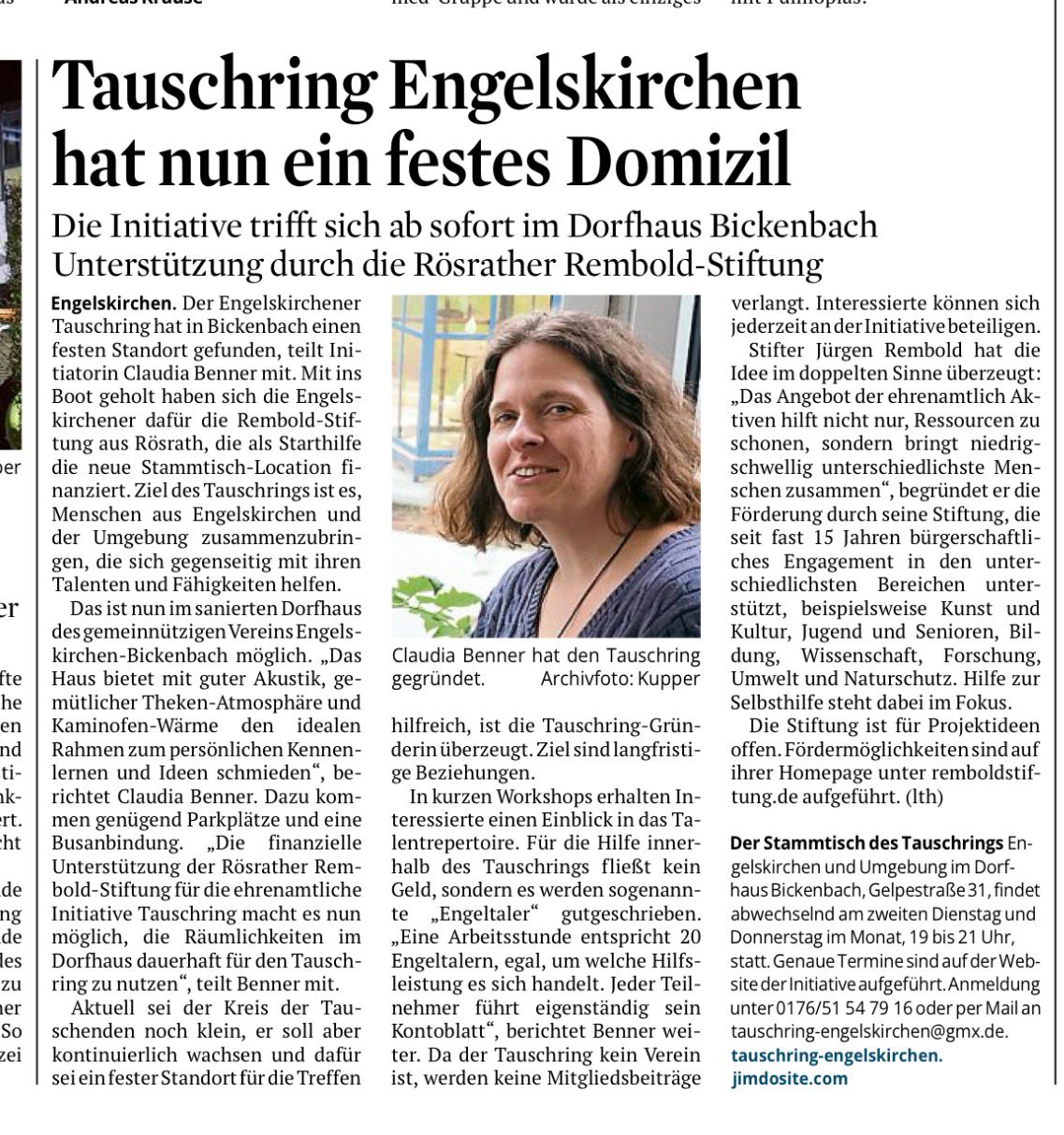 Stifter Dr. Jürgen Rembold hat die Idee im doppelten Sinne überzeugt: „Das Angebot der ehrenamtlich Aktiven hilft nicht nur, Ressourcen zu schonen, sondern bringt niedrigschwellig unterschiedlichste Menschen zusammen“, begründet er die Förderung durch seine Stiftung. Infos unter https://tauschring-engelskirchen.jimdosite.com